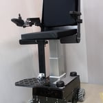 このモデルは全方位駆動部の「ムーンウォーク」と高機能リフト「ペガサス」をドッキングさせたものです。特長は何と言っても「横に動くことができる」唯一の電動車いすです。いすの向きはそのままに、真横でも斜め前でもうしろへも、ジョイスティックを倒す方向へ水平移動ができます。実際の操縦は非常に簡単で、ノーマルと全方位の切り替えスイッチとジョイスティックです。ノーマルモードは普通の走行、全方位モードにすると水平移動走行ができます。